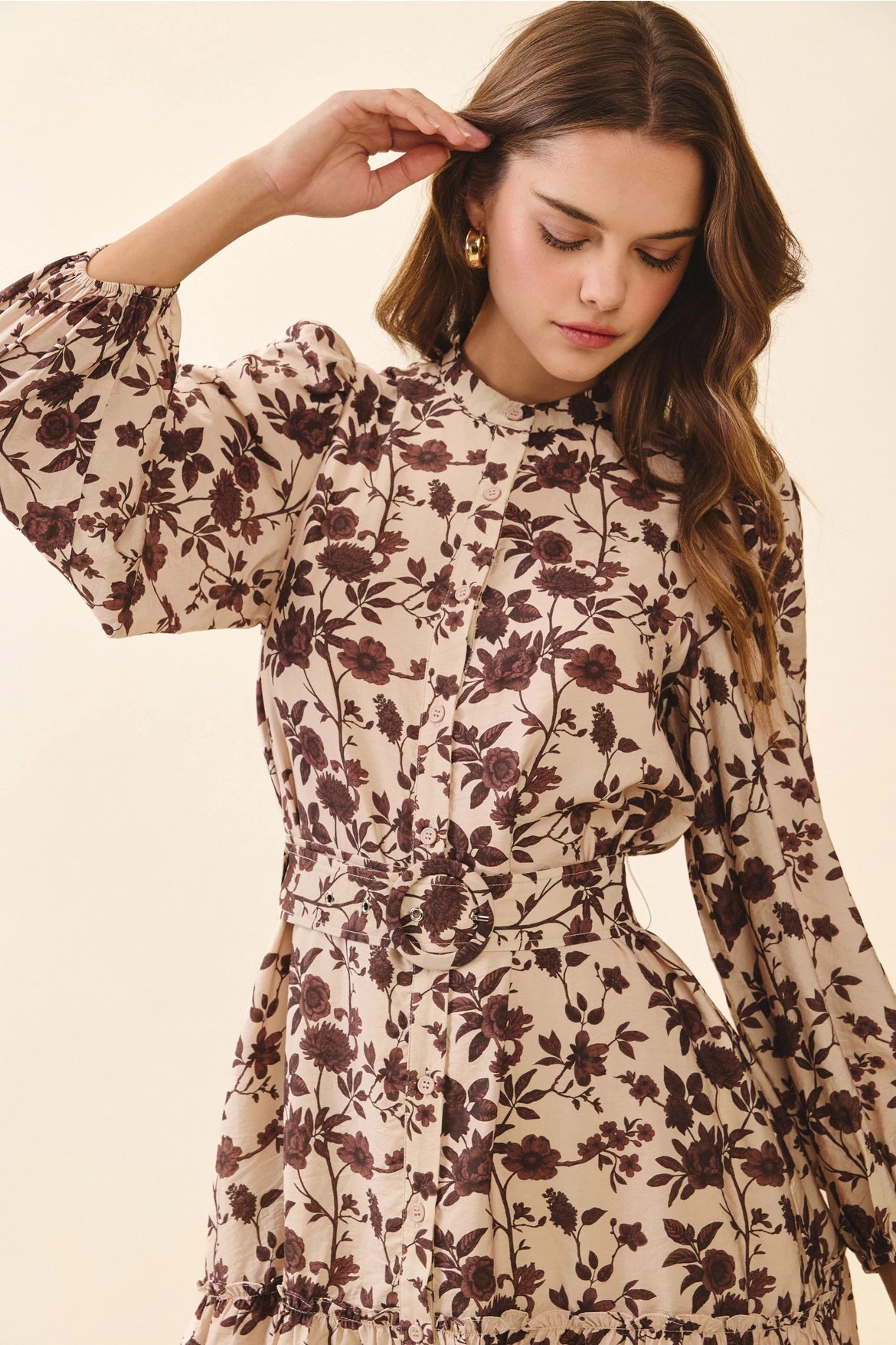 Beige LS Floral Print Buckle Belt Dress