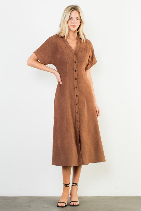 Brown Suede SS Button Down Midi Dress (THML)