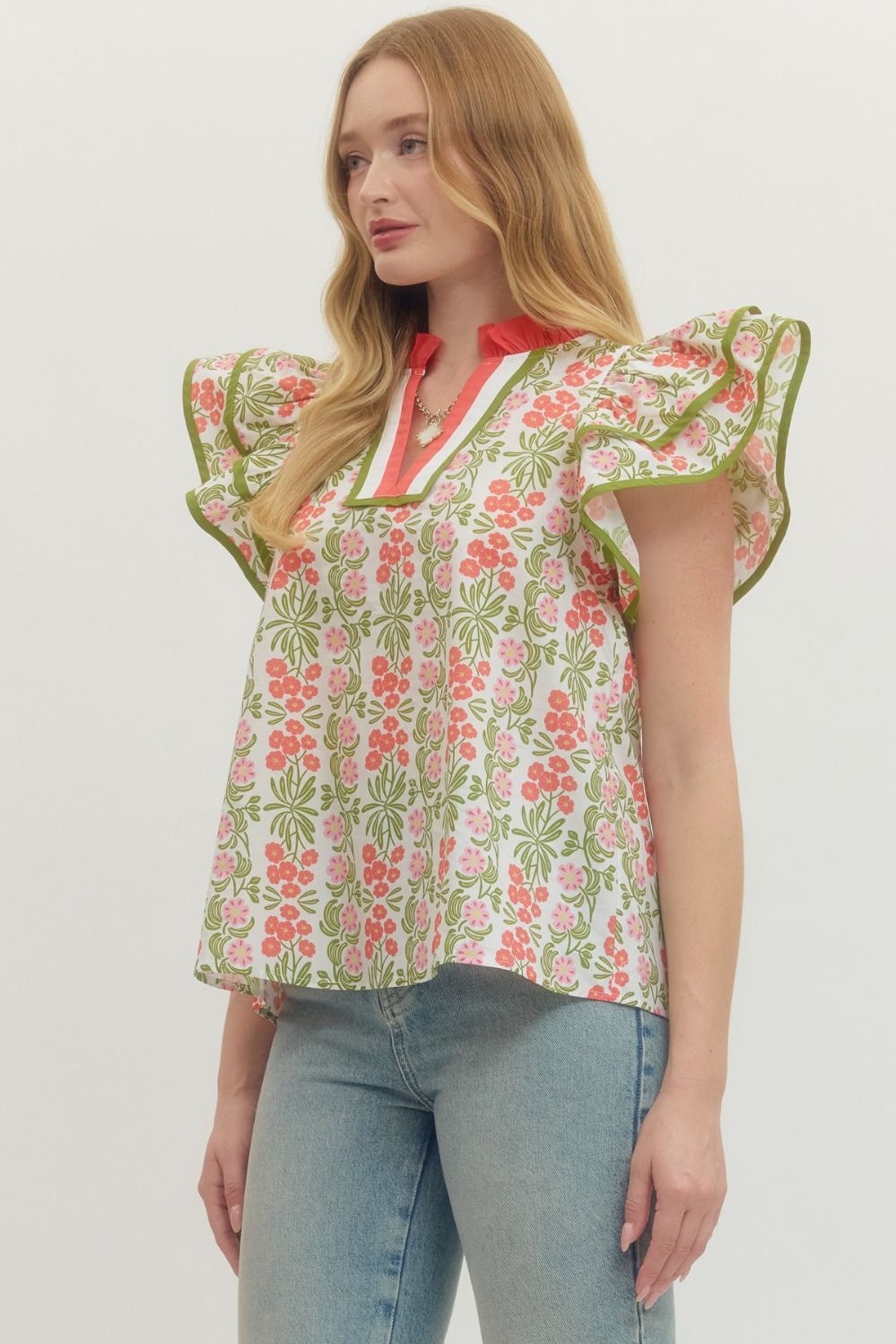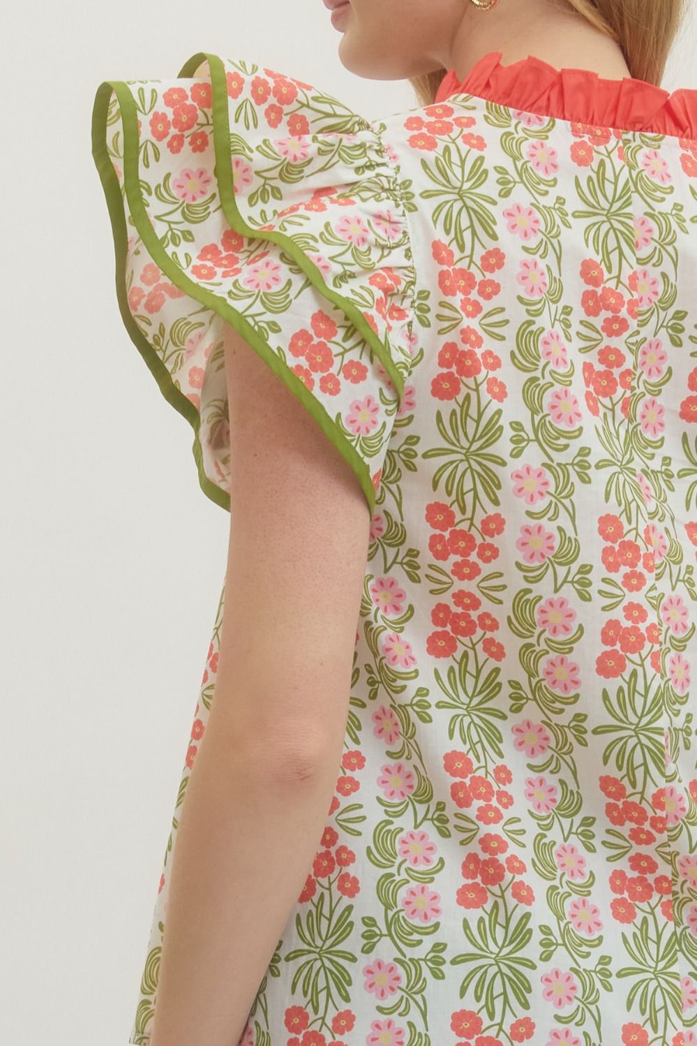Coral/Green Printed Flutter Slv Top