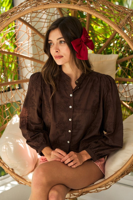Lace Floral LS Button Down Blouse Dk Brown