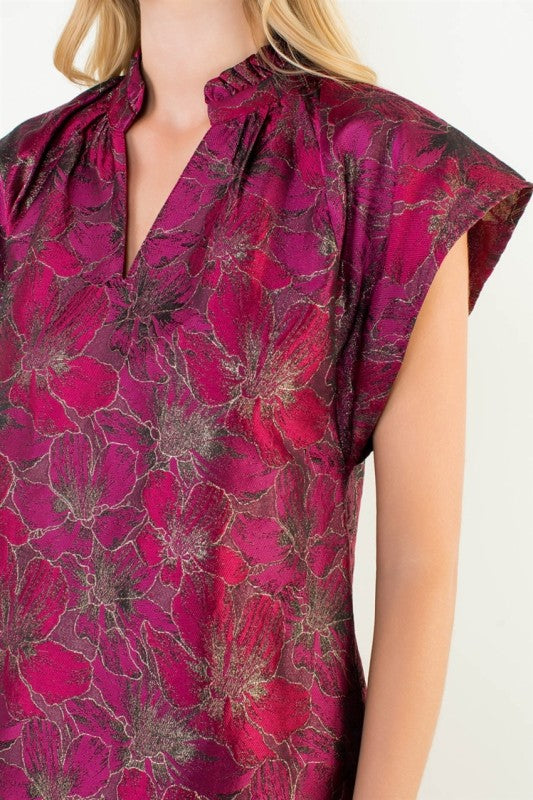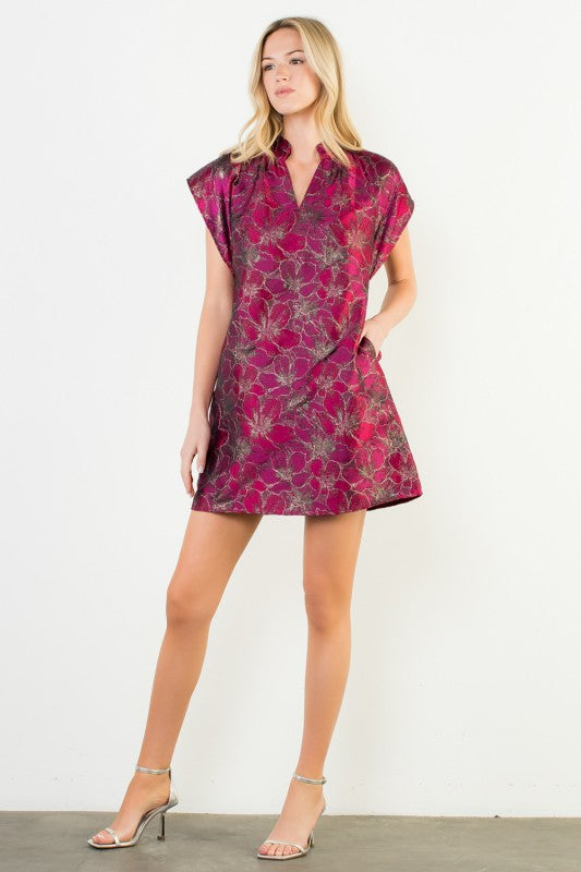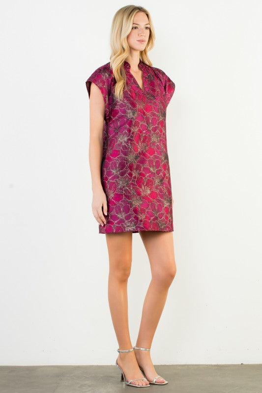 Magenta Floral Print SS V-Neck Dress (THML)