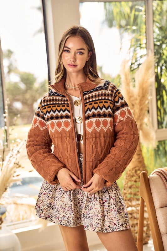 Rust Nordic Zip Up Knit Puff Jacket