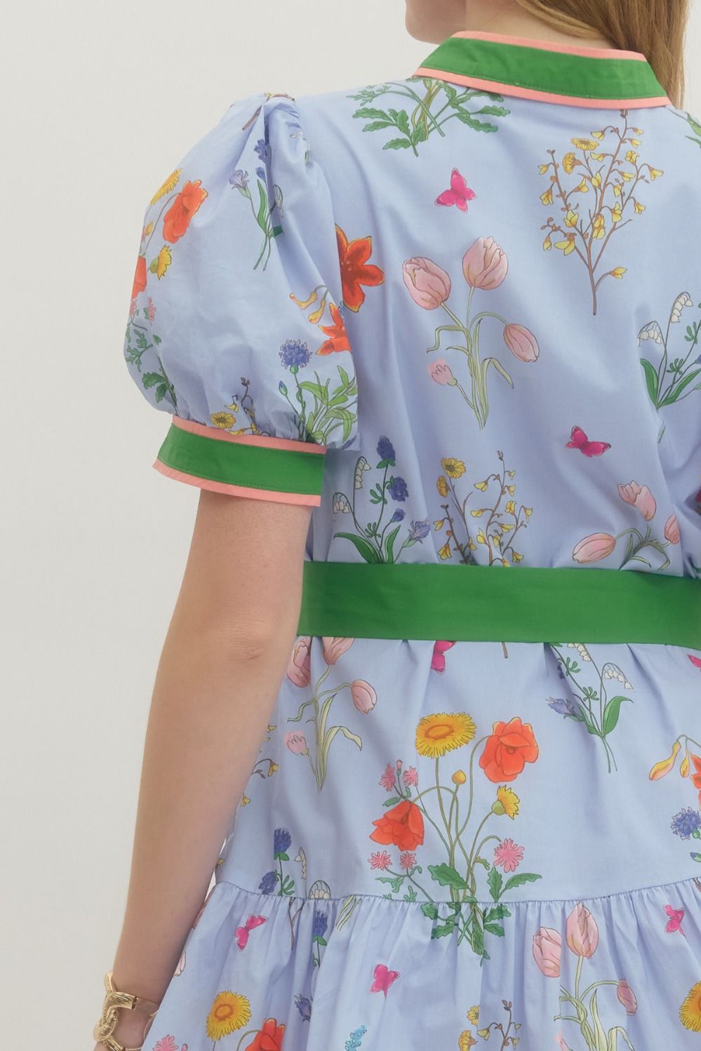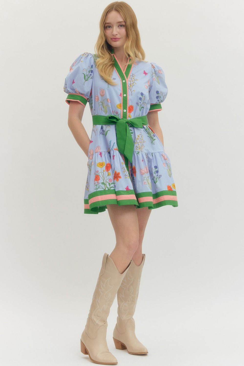 Blue Multi Floral Puff Slv Waist Belt Dress