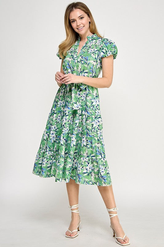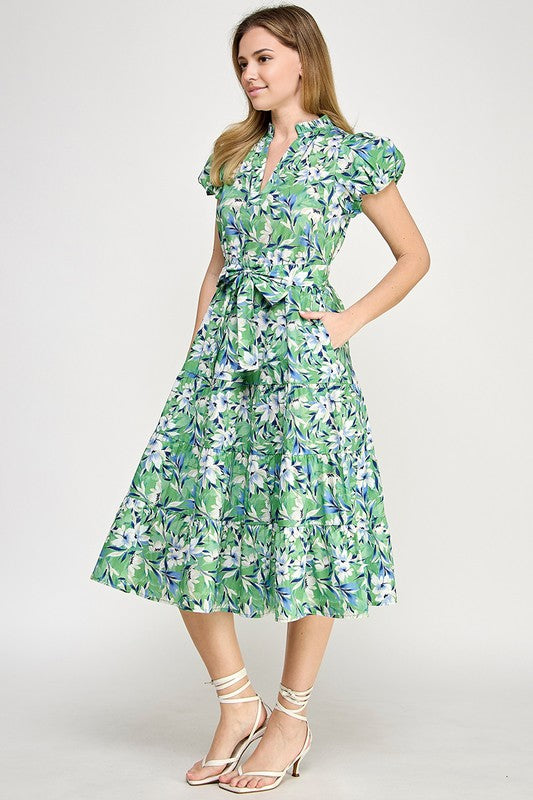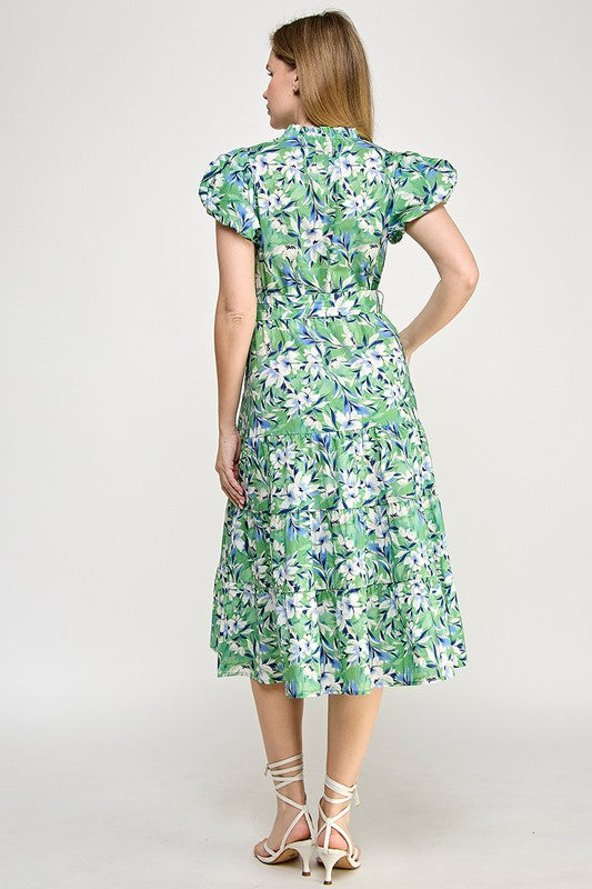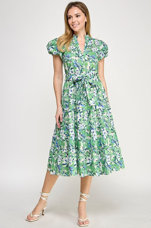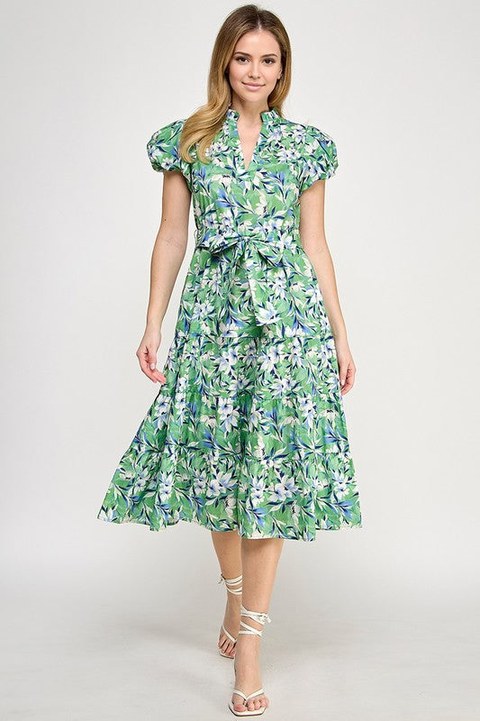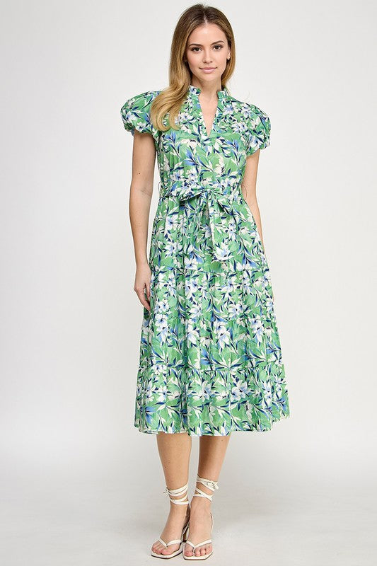Green Multi Floral Puff Slv Midi Dress