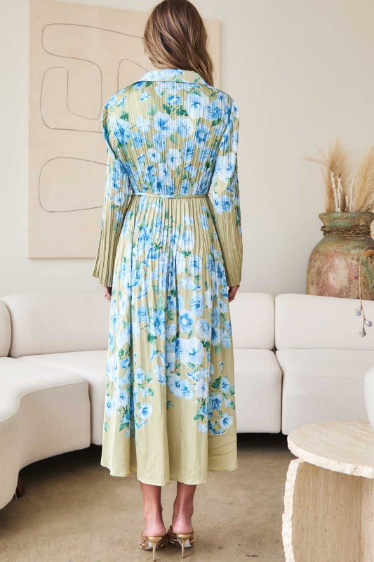 Light Olive/Blue Floral Pleated Collared Midi Dress