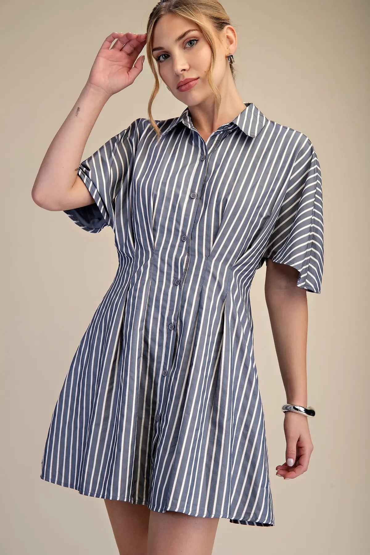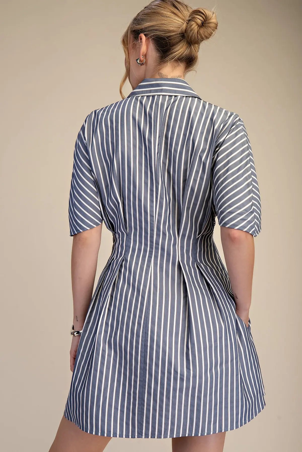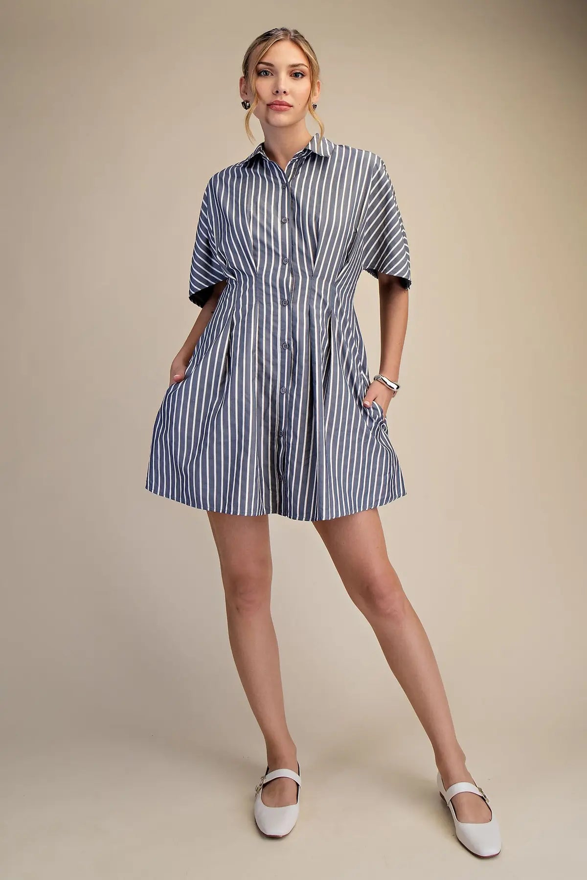 Navy Striped SS Belted Shirt Dress