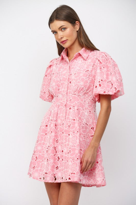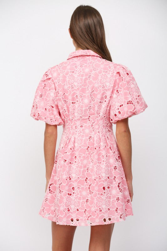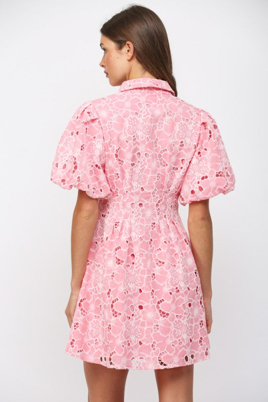 Pink Cut-Out Floral Lace Puff Slv Dress