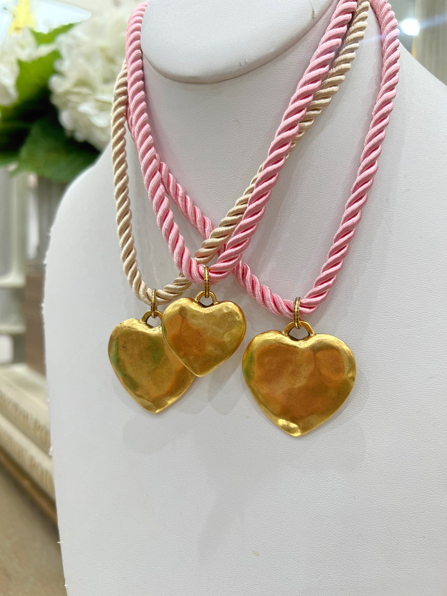 Gorgeous colors available in this cord necklace with hammered gold pendants available in powder blue, soft pink, creamy taupe & red.
