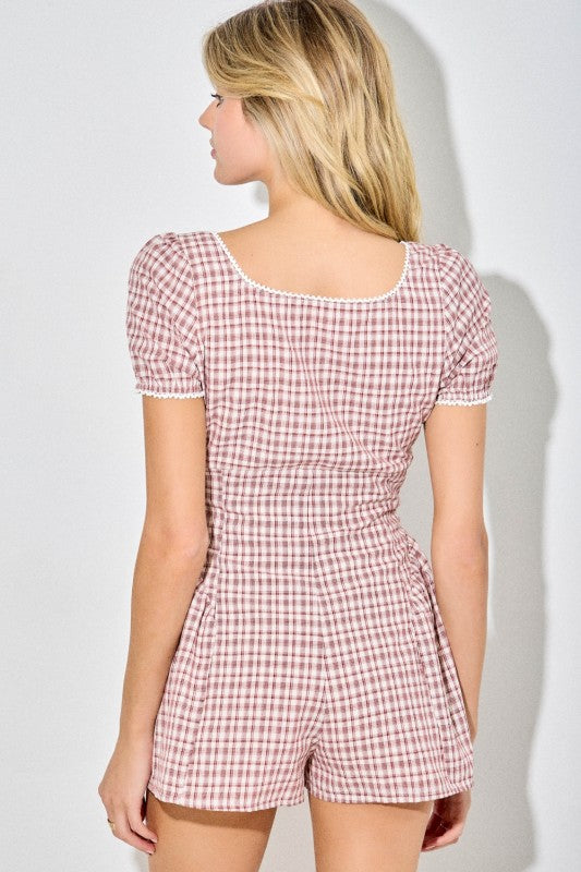 Ivory/Red Gingham Square Neck Button Romper