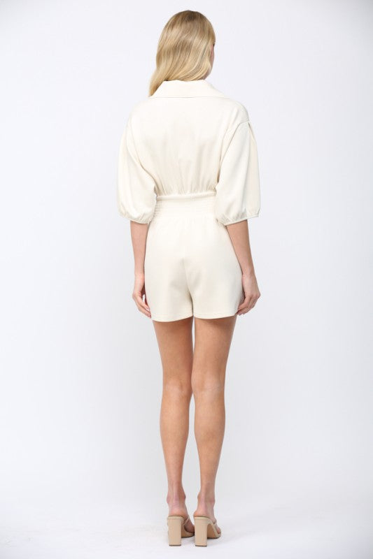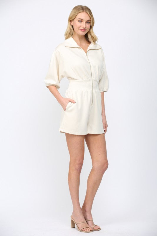 Scuba Soft Frnt Zip Smocked Waist Romper Ecru