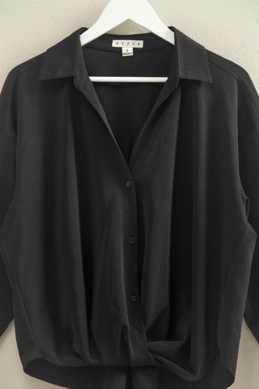 Timeless meets modern in our Black Long Sleeve V-Neck Button Down Blouse. Crafted from a soft, fluid fabric, this blouse features a classic collar, a flattering v-neckline, and a button front closure. The relaxed fit and subtle front drape detail offer an effortlessly chic silhouette, perfect for workdays or weekend plans. Style it tucked into trousers for a polished look or pair with denim for casual sophistication. A versatile must-have in every wardrobe.