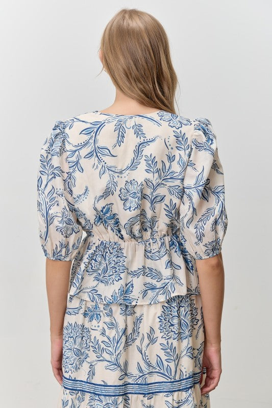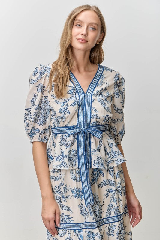 Blue Paisley Printed V-Neck Tie Frnt Peplum Top