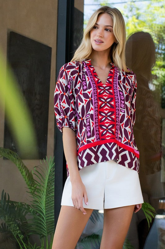 Brown/Red/Pink Print V-Neck Puff Slv Top (THML)