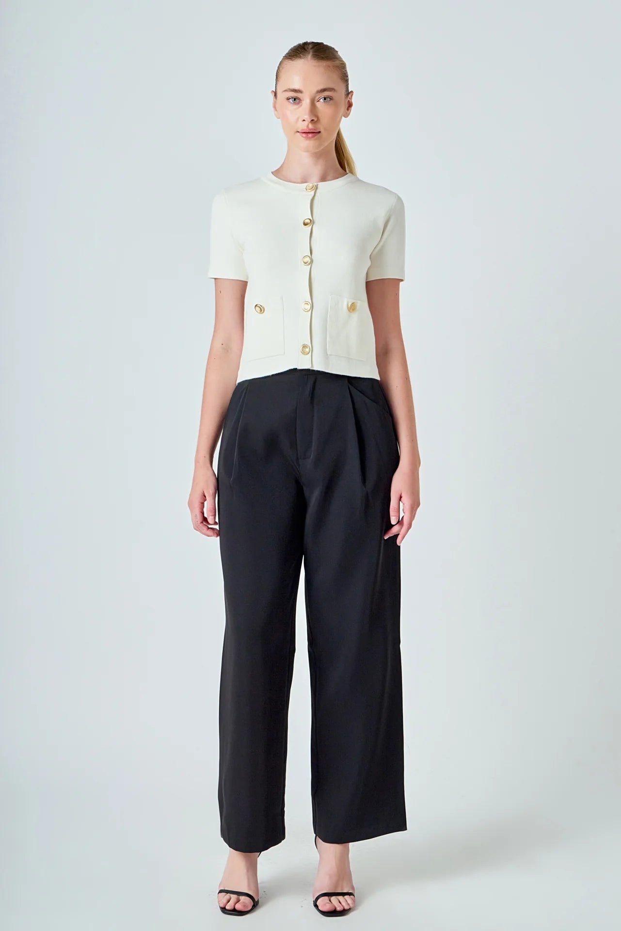 Elevate your everyday style with this timeless cream cardigan top. Crafted in a soft knit, it features short sleeves and a refined, boxy silhouette that pairs effortlessly with trousers, denim, or skirts. The luxe gold button detailing down the front and on the pockets adds a touch of sophistication, making it a versatile piece you can dress up or down. Perfect for layering or wearing as a standalone statement.