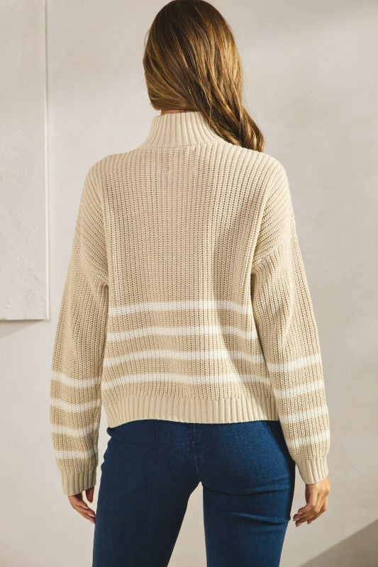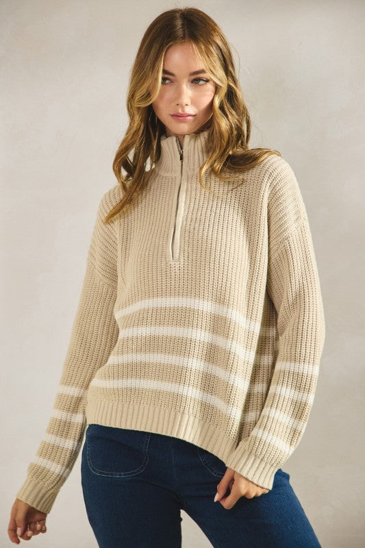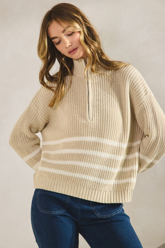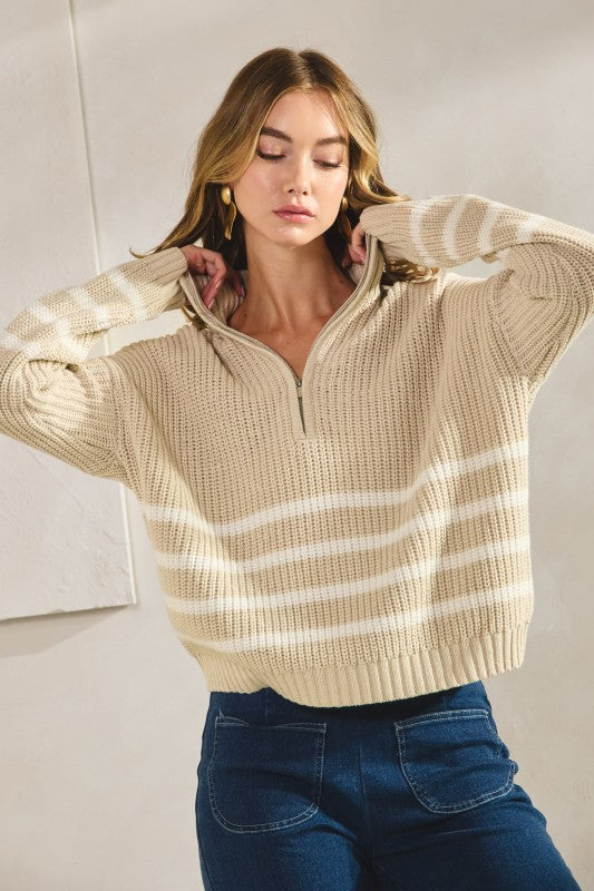 Oatmeal Striped Ribbed Half Zip Sweater Top