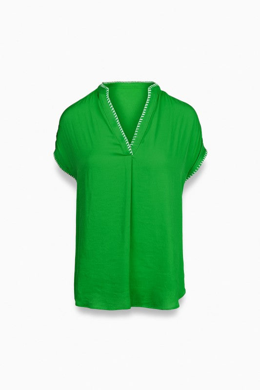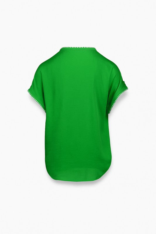 Fresh, vibrant, and effortlessly chic — this green blouse adds a pop of color to your everyday wardrobe. Designed with a relaxed silhouette, it drapes beautifully for a flattering fit that’s easy to style. The V-neckline and sleeves are finished with whipstitch detailing, giving it a subtle handcrafted touch. Lightweight and comfortable, this versatile blouse pairs just as well with denim for casual outings as it does with skirts or trousers for a polished look.