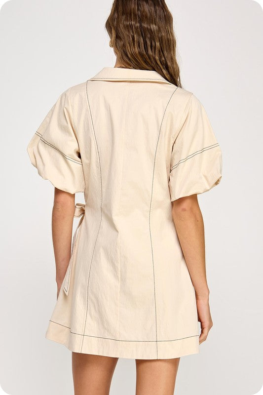 Chic meets effortless in our Ecru/Black Stitch Wrap Collared Mini Dress. This flattering wrap-style silhouette features a pointed collar, short sleeves, and a self-tie waist for a customizable fit. Contrast black stitching adds a modern, tailored edge to the soft ecru fabric, creating a look that’s both minimal and elevated. Perfect for daytime outings or casual evenings, this mini dress is your go-to for laid-back sophistication.